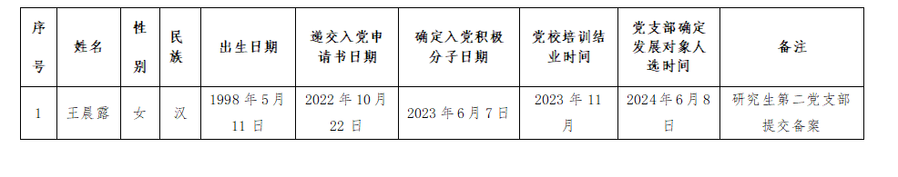 公司研究生王晨露同志入党积极分子教育培养满一年,经相关支部审查基本条件、征求党内外意见、支委会研究、伟德国际1946党委备案审查,将该同志列为发展对象。根据发展党员工作相关要求,现予以公示。