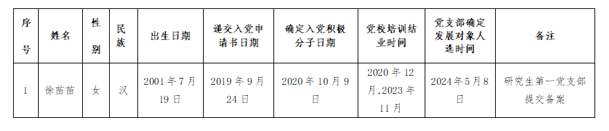 公司研究生徐苗苗同志入党积极分子教育培养满一年,经相关支部审查基本条件、征求党内外意见、支委会研究、伟德国际1946党委备案审查,将该同志列为发展对象。根据发展党员工作相关要求,现予以公示。