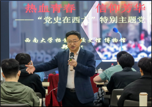 郑劲松老师以《热血青春 信仰芳华——“党史在西大”》为题开展专题教学,从江姐与西大学子的渊源讲起,围绕初心、使命、反思、梦想四个维度,将党史学习教育与校史传承深度融合。通过袁隆平、胡锦矗等杰出员工的治学事迹,展现公司深厚文化底蕴;结合黎洁霜、萧明华等革命先烈的英勇故事,引导学员领悟红色精神内核。他勉励学员深耕专业领域,积极参与校史馆数字化建设,以青春力量传承红色基因,书写新时代青年华章。