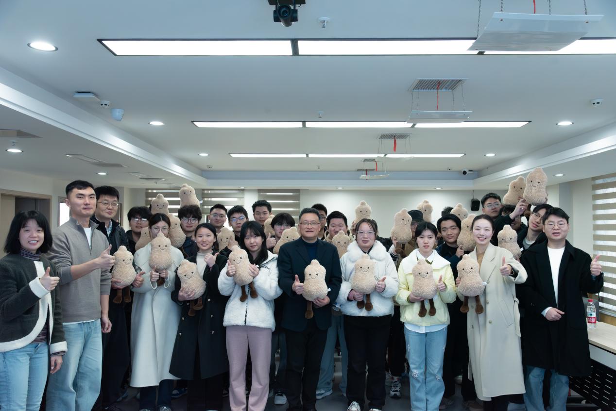 交流结束后,公司领导、老师向考研员工赠送“考研加油包”。花生玩偶——寓意“好事发生”,旺仔牛奶——寓意万事兴旺,文具套装——为学子们提供便利与支持,饱含了公司的深切关爱与殷切期望。同学们高举玩偶,在“一战成硕”的祝福语中共同留下了珍贵的合影。