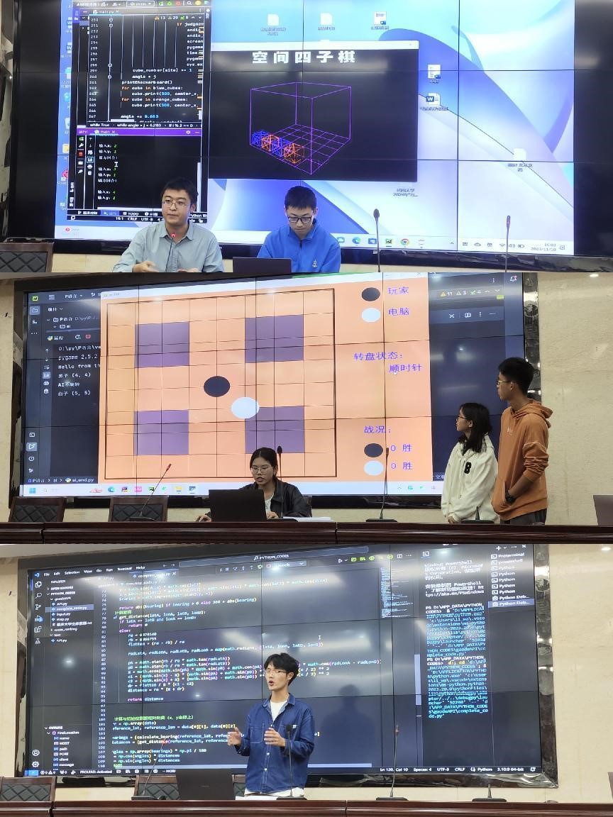Python现场编码要求选手们在一小时内,在不借助网络的前提下完成自己的作品,随后进行筛选,在32组中选择15组进行后续的3分钟展示和答辩。这不只是考察选手们的编码速度,更是考察选手们的创新能力。在1个小时内,选手们独立完成代码的编写,设计出自己独特新颖的作品,由公司副教授潘东波,公司教师陈睿、吴鹏程组成的评委团针对选手们的作品进行点评。
