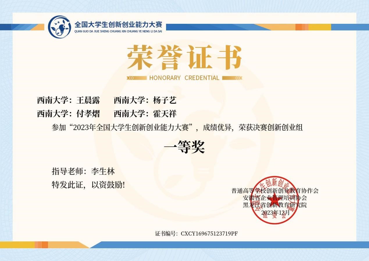 在决赛创新创业组别中,评审专家组依据作品的创新性、实用性、市场潜力等多个维度进行了全面的评审,由李生林教授指导的王晨露、杨子艺、付孝熠、霍天祥团队荣获全国一等奖,同时,李生林教授被评为优秀指导教师。