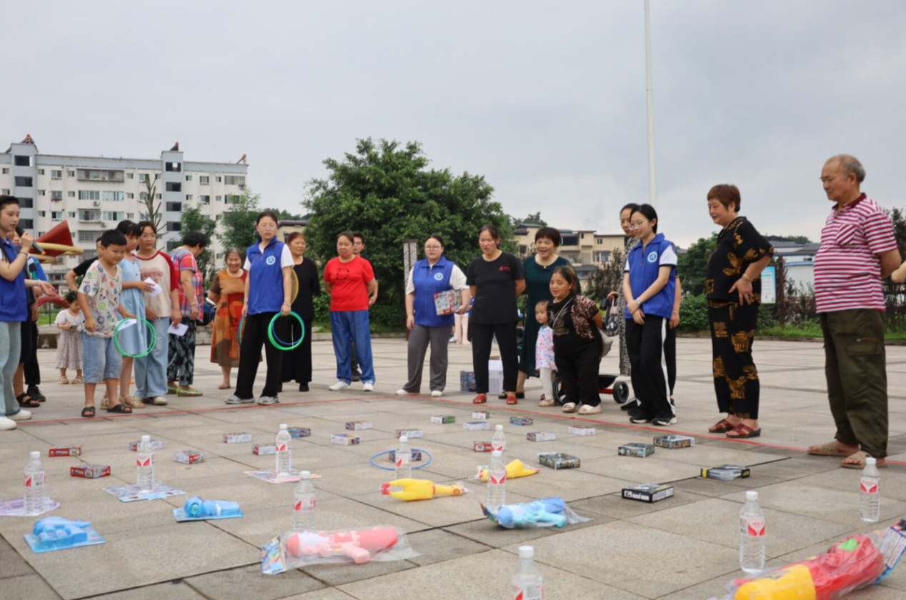 此外,本次活动还于7月3日晚18:30,在直升镇思源广场举办套圈游戏和播放露天电影,在实践团成员们的热烈邀请下,村民们踊跃前往广场参加活动,为活动增添许多乐趣。实践团成员们也在忙碌的进程中体会到了热烈、欢乐的乡镇氛围。