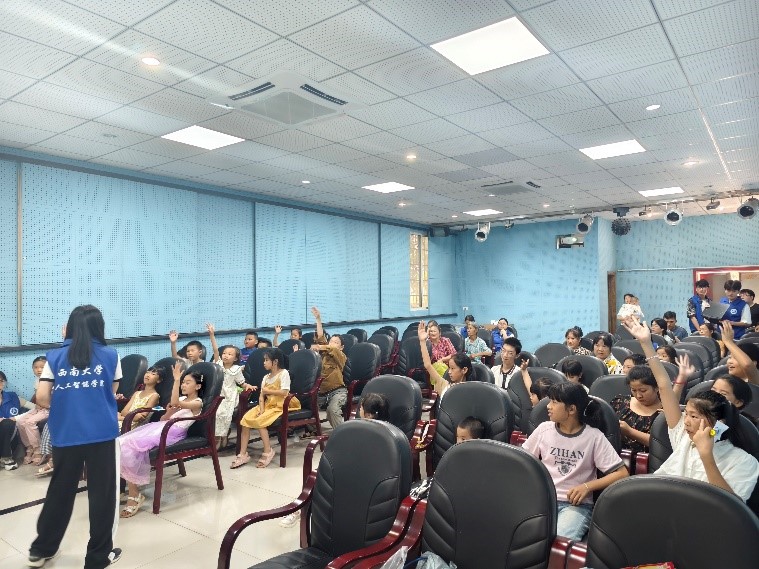 7月4日下午2:30,实践团成员们在直升镇红色家园举行AI小课堂。面对各位可爱的小朋友,小课堂成员们首先讲解了“什么是人工智能”,迅速吸引小朋友注意力,激发他们对未知世界的好奇;接着介绍了人工智能目前的应用,用简单的关键词生成体验“AI音乐”、让小朋友用“AI绘画”在虚拟雪山上攀岩,将小朋友的奇妙构思变为现实。然后,小课堂成员引导小朋友与ChatGPT进行对话,体验先进的AI技术。最后,带领小朋友们学习“AI云旅游”活动中幕后工作流程并介绍实现原理。整个课堂趣味与学习氛围交织,其乐融融。