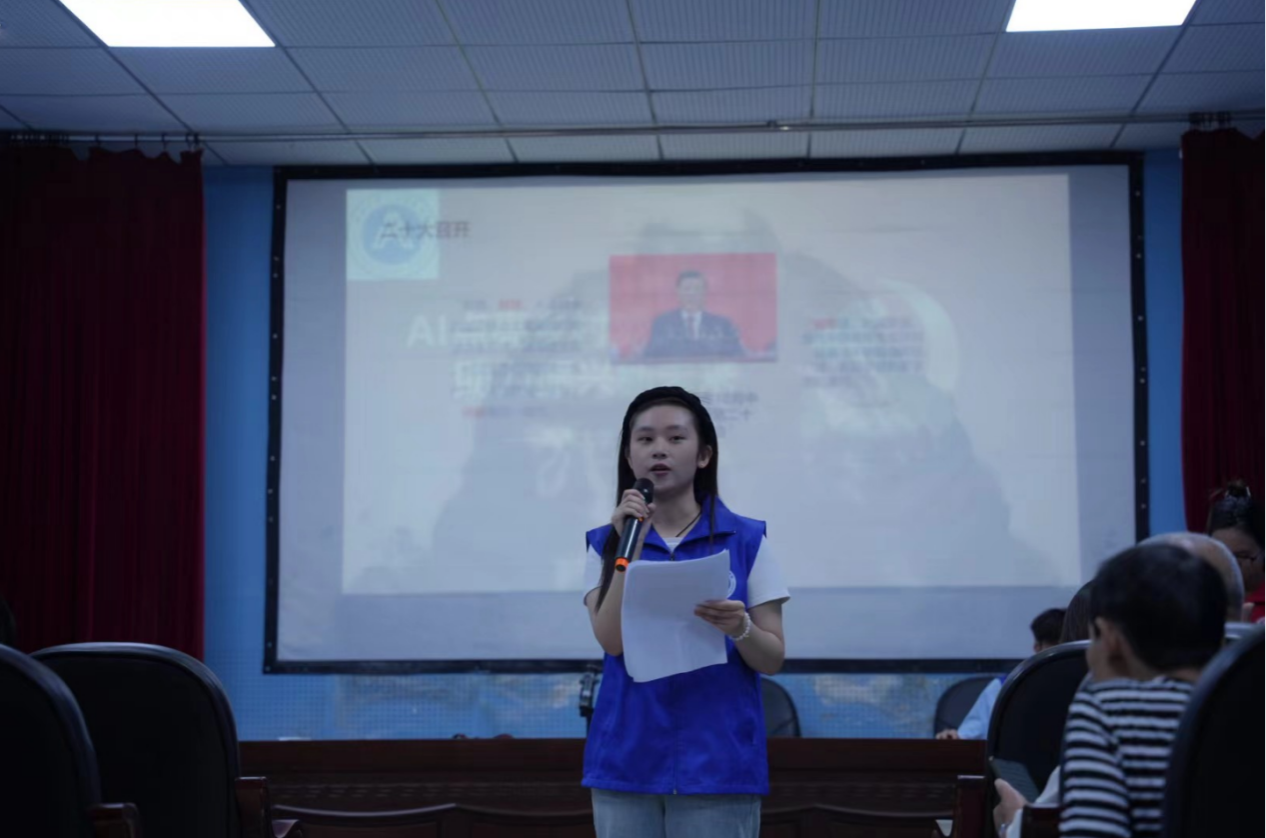 7月3日早9:30,宣讲组在直升镇红色家园采取多种形式紧紧围绕“养老政策”、“AI换脸等防诈知识”“新质生产力”三个主题进行宣传讲解。首先,宣讲组成员们以情景演绎的形式为村民们再现生活中可能存在的诈骗形式,帮助村民们树立防范意识;接着,以一问一答的形式讲解两会中与村民日常生活息息相关的政策和精神;最后,宣讲人员与观众互动提问,全场老人积极互动,现场氛围热烈欢快。