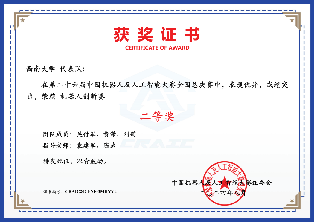 近日,由中国人工智能学会主办的第二十六届中国机器人及人工智能大赛全国决赛成绩陆续公布。历经省赛和全国总决赛,由公司教师袁建军,学子吴付军、刘莉领衔的代表队在“机器人创新赛”赛项获得了全国二等奖。