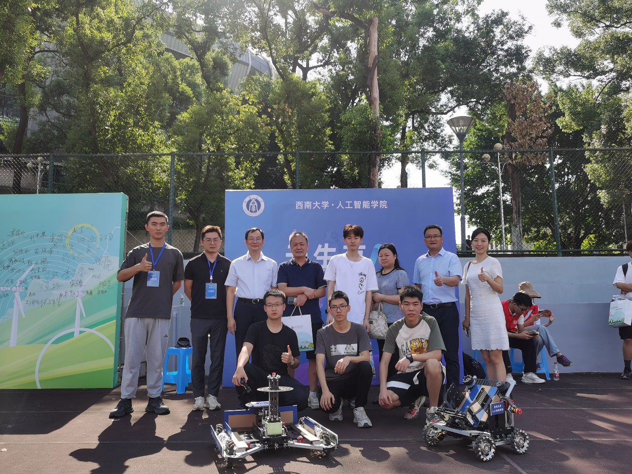 (公司领导和机器人战队与新生在伟德国际1946立牌前合影)