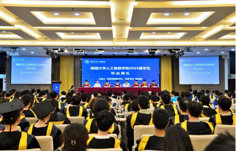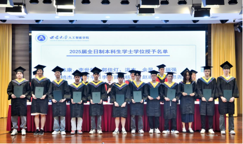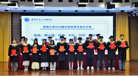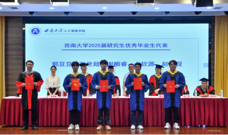 在毕业典礼上,公司教师代表、毕业年级班主任钟明洋老师向同学们送上热烈祝贺,希望大家坚守初心、勇于担当,保持终身学习,感恩他人,豁达面对起伏;母校永远是坚实后盾,愿同学们以“不惧挑战,主宰战场”的勇气,书写辉煌人生,前程似锦。数据科学与大数据技术专业本科毕业生陈俊霖、计算机科学与技术专业硕士毕业生张世超作为毕业生代表发言。陈俊霖在致谢母校、师长与同窗的同时,回顾四年与公司共成长的求学点滴,感悟技术需融入人文关怀与社会责任感的真谛,愿毕业生们携 “天生路 2 号” 的烙印奔赴未来,以智能之力服务大众、不负时代。张世超以感恩之心回顾三年求学中学习科研、竞赛实践与校园生活的成长点滴,呼吁在 AI 时代永葆终身学习热忱,愿毕业生们前程似锦、为社会发展贡献力量。